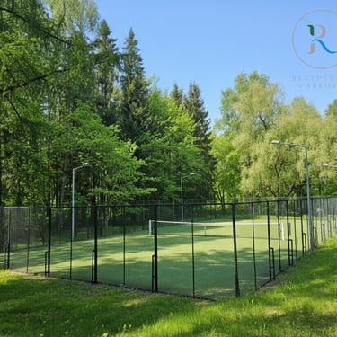 Kort tenisowy i boisko do siatkówki plażowej – aktywny wypoczynek w pięknej scenerii.